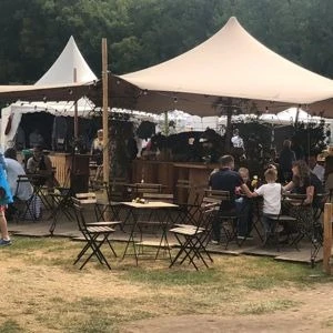 Zandkleurig doek met houten sfeer palen.