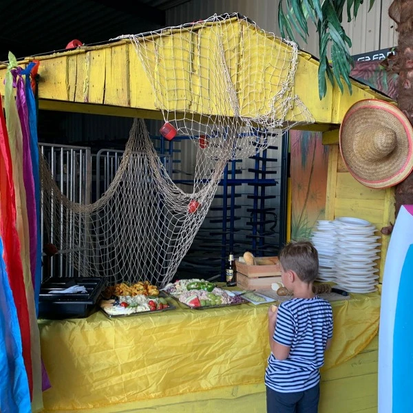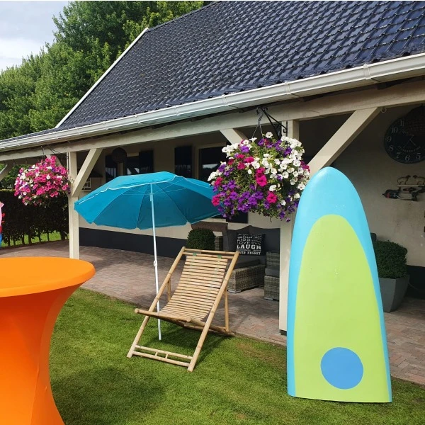 2 surfplanken, 2 strandstoelen, visnet en reddingsvest.