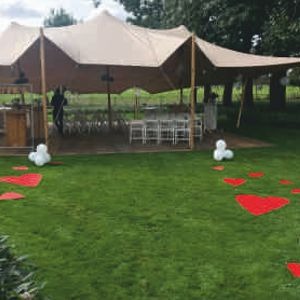 Inclusief schapenvacht, witte kussentjes en decoratie 'Bride & Groom'.