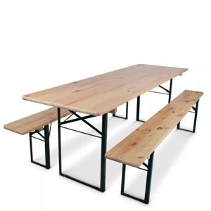 Hout, 2 tafels van 220 x 70cm en 4 bankjes van 220 cm lang.